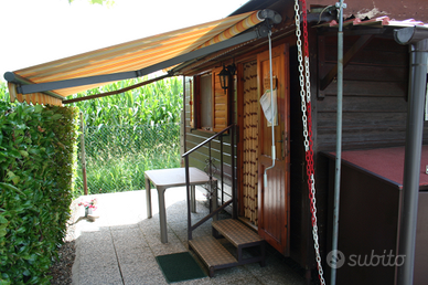 Vendesi preingresso in legno per roulotte. Dimensioni 4m x 2m con tetto coibentato e tenda da sole ARQUATI. Completamente arredato come da foto (quasi nuovo), con gas per cucinare, corrente, televisione con antenna esterna e armadietto esterno come porta bombole. Da vedere!