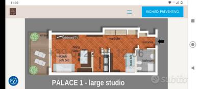 Monolocale 4 posti letto (40 mq.), di cui 2 in zona notte riservata, arredato con mobili in legno massello di stile montano, dispone di angolo cucina attrezzato e accessoriato con zona cottura, frigorifero e lavastoviglie, cassetta di sicurezza, bagno con doccia e phon, biancheria da bagno/letto/cucina, ampio balcone affacciato sulle montagne attrezzato con sdraio, posto auto personale in autorimessa.