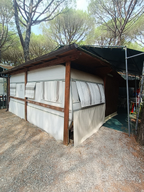 Struttura fissa presso Camping le Gorette Cecina, composta da Roulotte, veranda e cucina in legno con porte e finestre, 5 posti letto (ampliabili a 6/7). Copertura ignifuga, pavimento in gomma traforata rialzato su ghiaia. Piano cottura, fornetto e frigorifero.