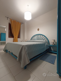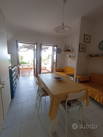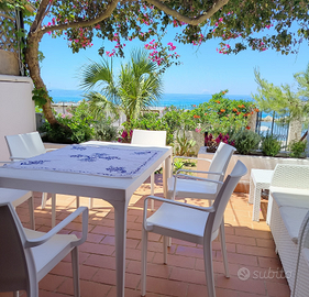 Terrazzo ben arredato vista mare per splendidi tramonti dotato di sedia sdraio, tavolo e poltrone,cucina soggiorno con due divani letto, bagno e camera da letto.
