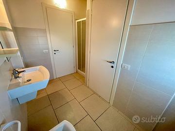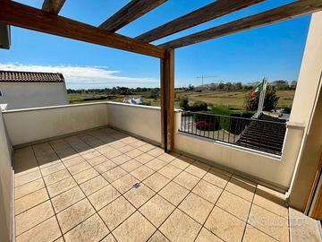 La terrazza abbraccia interamente la zona giorno ed è orientata a sud-ovest, regala quindi una piacevole vista sul verde e sul mare all'orizzonte.