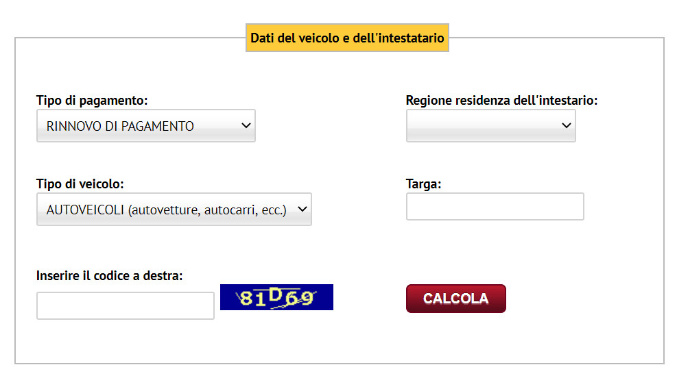 Ci apparirà una semplice schermata dove dovremo inserire i dati fondamentali per interrogare il database dell’Agenzia: Regione di immatricolazione, categoria del veicolo (autoveicolo, motoveicolo, rimorchio o ciclomotore) e targa del vaicolo. Poi dovremo scegliere l’anno per il quale vogliamo verificare il pagamento e, infine, inserire il codice di sicurezza captcha e, infine, fare click su “Calcola”.