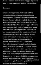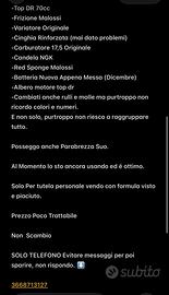 Esteticamente perfetta, Raffredato ad Aria Lampadine Bianche Posizione Abbagliante e Anabbaglianti, Specchietti originali comodissimi, Gomme Montate a Ottobre NUOVE, Scarico Top Nardò Presa nuova, montata sempre ad ottobre, motore Top Dr 70cc Ancora in rodaggio (ritirata la moto al meccanico il 24/01, (Fattura come prova) tutto in regola, ogni singola vite é originale. non uno scascione come gli altri scooter modificati, sempre tenuta con cura, e fatta come si deve . presenta frecce dinamiche led posteriori. Tagliando effettuato sempre ad ottobre. e adesso, Ricarburazione ecc.. Accensione Elettronica, Cuscinetti paraoli originali piaggio nuovi , Interruttori stop dx sx... Cinghia e pompa miscelatore nuovi tubi benzina appena rimesso (dicembre) .... sono stati eseguiti molti lavori , molti pezzi nuovi, sempre originali o marca buona da quando ce l'ho io maggio 2024, purtroppo non riesco a raggrupparli tutti, ma sto motorino è veramente un gioiellino, ci ho speso tanto.