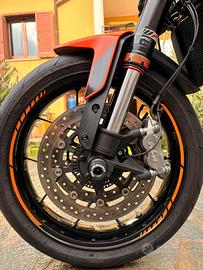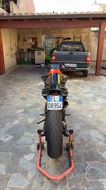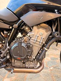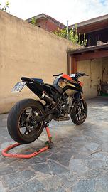 Vendo KTM Duke 890 L depotenziata a libretto (attualmente a piena potenza) guidabile con patente A2 La moto ha 36.000 km ed è stata trattata in modo maniacale. Sempre tenuta in garage al coperto, mai tirata a freddo e sempre tagliandata regolarmente nel rispetto delle scadenze previste. La catena è stata lubrificata ogni 300 km e pulita ogni 1.000 km. La moto è stata rimappata presso l'officina SC BIKE, con una potenza rilevata di 128,7 CV all'albero e 117,2 CV alla ruota. Manutenzione recente: * Kit trasmissione (catena, corona, pignone), circa 1000km Pneumatici: Appena montate le Supercorsa sp2 Accessori e componenti installati (valore totale circa 2.246 ?): POMPA FRENO RADIALE BREMBO RACING 19 RCS(358?) DECAT MIIV (171?) TERMINALE MK3 NERO(264?) MAPPATURA CENTRALINA (400?) TECH PACK(+- 800?)(mappa track, quickshifter sia in salita che in scalata, MTC, MSR) SPECCHIETTI MANUBRIO (50?) PORTATARGA REGOLABILE CORTO(100?) FILTRO ARIA SPORTIVO BMC(60?) MONOPOSTO ALIEXPRESS (43) I PEZZI ORIGINALI SONO TUTTI INCLUSI. Decat originale Scarico originale Frecce originali Portatarga originale Specchietti originali Biposto originale Filtro aria originale Pompa freno originale