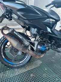 aerox elaborato che monta i seguenti pezzi: tpr70 monofascia alluminio:200€ albero motore top sp10:150€ marmitta mhr:379€(in foto è solo sporca) collettore polini:60€ carburatore 21 PHBG:71€ filtro a cono:15€ pacco lamellare malossi carbon:50€ rubinetto benzina a caduta libera:12€ gomma michelin appena messa:60€ ammortizzatore mono yss:110€ variatore malossi:75€ ventolino malossi:30€ frizione malossi delta clutch:75€ cinghia malossi:20€ campana malossi:30€ faro one:30€ revisione pompa acqua top:20€ gas rapido domino:55€ batteria appena montata con impianto elettrico perfetto tutte le carene str6 appena messe carene interne nuove all interno del prezzo sono inlusi un manubrio naked blu:60€ sella ricamata blu