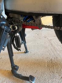 Monta un kit che abbassa di 3 cm la moto portandola a 89 cm alla sella ( anziche’92… , ma si puo’ rimettere ad altezza originale)la sella tuttavia si puo’ abbassare di altri 2 cm
