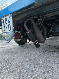 Monta motore 136cc malossi ghisa, fatto aspirato ai carter, carburatore phbg 28 frizione rinforzata, campana rinforzata bolla 24/72, espansione artigianale derivazione vespa e accensione vmc 1,4kg.