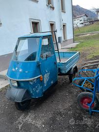 Vendo come da titolo ape Piaggio 50 del 1982, l ape monta un motore di 90 cc, impianto elettrico perfettamente funzionante, tergicristallo a pedale, accensione tramite leva e tiro leva aria sotto il sedile, retromarcia leva sotto il sedile,NO riscaldamento, 4 marce, alimentazione a miscela a 2%, appena sostituiti i 3 copertoni, revisione totale forcella anteriore e parte del motore, sistemazione supporto ruota di scorta sotto il cassone, perfetta con targhe e libretto; da rivedere la vernice nella parte anteriore e qualche piccola botta. Perfetta in tutte le sue parti meccaniche e come già detto in REGOLA. No affaristi o perditempo. Prezzo trattabile. Per foto o informazioni non esitate a contattarmi. Se l annuncio è presente il mezzo è disponibile.