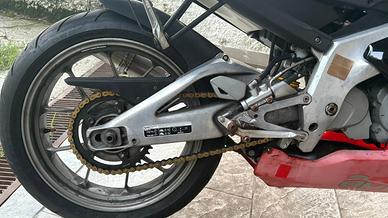 Vendo a malincuore bellissimia e ormai storica rs 125 2t con motore leggermente elaborato con: travasi lavorati e pistone mono sfascia, scarico completo arrow in titanio, valvola rave elettronica funzionante, centralina bucata... la moto é depotenziata a libretto guidabile a 16 anni ma sviluppa tutti i suoi veri 33 cavali anche qualcosa in più. Si presenta in buone condizioni generali c'è da considerare che é comunque del 2008, motore impeccabile appena fatto controllare, con pistone con all'attivo 80km, kit trasmissione d.i.d. Oro nuovi, usati si é no per 20 km, il telaio ha 57700 km ma il motore é come nuovo, per il resto le parole non servono vederla per credere, vendo per passaggio a cilindrata superiore prezzo 3200...