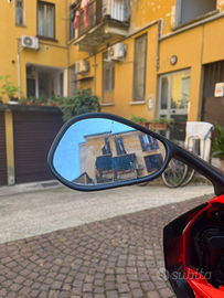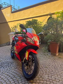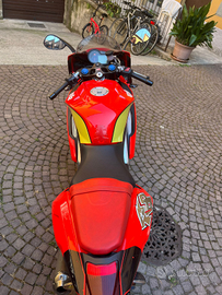 La moto è rimasta ferma in box dal 2010 o giù di lì per un fermo amministrativo, adesso è in regola da giugno, gomme, candela, batteria e pastiglie dei freni appena comprate per ripristinarla, revisionata e tagliandata a giugno, tutti i liquidi nuovi, ho chiesto al meccanico di fare un check up generale e l ho assicurata che la sto usando un pochino per testarla e funziona alla perfezione. La moto ha qual he difetto per via di una moto che le si è appoggiata addosso dai cavalletti, visibili in foto. L unica cosa che purtroppo non funziona e non saprei come ripristinare se non comprando un tachimetro nuovo è il totale dei km che resta fisso a 2828, tutto il resto del tachimetro funziona. Posso dire che la moto dovrebbe avere tra i 12 e i 15 mila km, ricordo che avevo festeggiato i 10k. Calcolate che per via del fermo ha girato per 3 o 4 anni quando ero ragazzo.