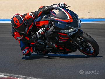 Aprilia RS 457 parla la lingua di chi non si accontenta e vuole avvicinarsi alla moto carenata cercando il knowhow di una vera sportiva. In poche parole: il miglior rapporto peso potenza per la patente A2. Con la grinta e lo stile tipici della gamma RS, si distingue per la tecnologia all'avanguardia e una struttura telaistica ereditata dalle supersportive Aprilia. RS 457 è un invito esplicito ad immergersi da subito nel coinvolgente mondo del racing.Le prestazioni di Aprilia RS 457 sono il risultato di soluzioni tecniche all'avanguardia e senza compromessi. Come l'adozione di un telaio in alluminio che sfrutta il motore come elemento portante. La forcella regolabile e l'impianto frenante completo di ABS a due canali con doppia mappa di utilizzo, assicurano sempre il massimo controllo. *prezzo f.c.* *SPEDIZIONI IN TUTTA ITALIA* Finanziamenti con prima rata a 6 mesi Finanziamenti a tasso 0 Finanziamenti con minirata