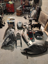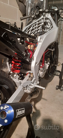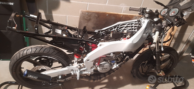 Vendo per cambio progetto aprilia rs 50 del 2002.Moto con documenti "libretto grande"È completa di carene "da riverniciare" un cupolino aggiuntivo perché il suo è rotto,scarico originale,un'altro avantreno completo di forcelle manopole semimanubri,gruppo termico originale 2 mono ammortizzatori e altri pezzi.La moto è stata fatta a pezzi e riverniciata "telaio".Monoblocco aperto e rifatto a nuovo.Dispongo di tutti i pezzi cambiati video e foto.Monta gruppo termico metrakit pro race4,albero motore rinforzato jasil,centralina polini con impianto luci "ormai introvabile"carburatore polini cp 28,collettore polini,pacco lamellare VL6,filtro aria malossi E13,candela ngk iridium,cuscinetti di banco e cambio skf,paraoli corteco,frizione rinforzata della top,pompa acqua nuova della top.scarico yasuni M3,mono ammortizzatore YSS a gas,forcelle revisionate e montato kit valvole interni per indurimento,pastiglie freno brembo,dischi nuovi,cuscinetti ruote nuovi,kit trasmissione catena corona pignone pbr,termometro Stage 6 mk2 con sensori temperatura in entrata e uscita,tubi freno in treccia aereonautico,pneumatici nuovi,revisione pompa freno posteriore.