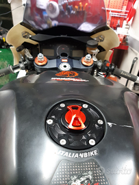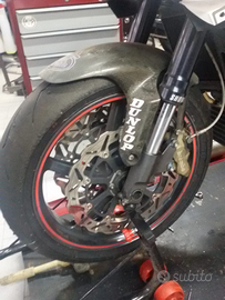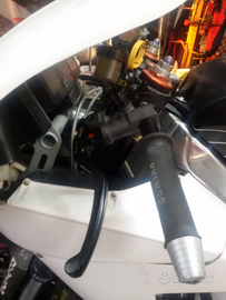 La moto ha tutti i pezzi per uso in strada, compreso scarico con omologazione, inoltre vendo con kit carene vetroresina da pista. Sostituiti i dischi freno anteriori, pompa frizione radiale, pompa freno anteriore radiale, pompa freno posteriore spostata e montata sulla pedana anziché sul vano motore. Inoltre sostituzione del mono posteriore, scollegato cablaggio della chiave di accensione e serratura del tappo serbatoio per apertura rapida. Si forniscono tutti i pezzi originali, inoltre un vantaggio elettrico in più, un cruscotto, i dischi freno originali. Per la versione stradale anche sellino posteriore e unghia monoposto. Per qualsiasi altra informazione non esitare a chiedere, prezzo trattabile.