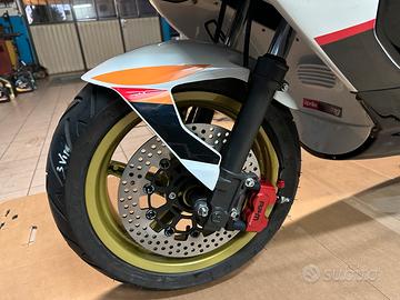 Lista lavori: carene replica poggiali ms, applicato decalc e poi vernice traparente, forcelle rigenerate con olio più denso,cilindro 172malossi, variatore malossi, modello a dado esterno,volano alleggerito, pacco lamellare carbonio, marmitta espansione crmos ma possibilità di monatre l'originale, carburatore 20.5 montato (phbg 24 disponibile),gomme nuove, freni anteriori maggiorati (disco,pinza, portapinza, tubo treccia nero).