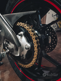 Moto utilizzata sempre in strada, no pista Tagliando appena fatto Vendo per passaggio ad altra categoria 35.000km 1000cc paraleva in carbonio frecce led rizoma mono ohlins regolabile gomme 70% (metzeler racetec RR 200) trasmissione DID parafango anteriore carbonio parafango posteriore carbonio copri catena carbonio copri carter carbonio copri telaio carbonio codino adattato RSV4 pinze Brembo scarico completo Akrapovic pedane arretrate lightch doppia chiave Parti originali Sellino biposto Pedane passeggero Scarico originale