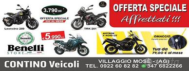 Leoncino 800 è la nuova icona di stile di Casa Benelli, pensata per farti provare emozioni uniche sia su strada che tra le curve. Una due ruote dallo stile autentico, contraddistinto da essenzialità e da un equilibrato mix di stilemi classici e moderni, che si sposano perfettamente con il motore più evoluto della gamma, da 754cc, che offre una potenza di 76,2 CV (56 kW) a 8500 giri/min e coppia di 67 Nm (6,8 kgm) a 6500 giri/min. Il telaio è un traliccio tubolare con piastre in acciaio, pensato per integrarsi alla perfezione con il design della moto e di assicurare la massima agilità e maneggevolezza su strada per qualsiasi tipologia di pilota, senza mai rinunciare al massimo divertimento alla guida. Il proiettore è interamente a led e presenta un design originale e ricercato, sottolineato dal disegno ad arco. Strumentazione all'avanguardia, in TFT, per un cruscotto dallo stile moderno ed autentico. Leoncino 800 è disponibile in Concessiona BENELLI AGRIGENTO a 6.990 EURO f.c. E' RIFERITO ALLA VERSIONE STRADALE ed è proposto nelle colorazioni grigio e verde, nei primi 5 contratti avrai una "OFFERTA SPECIALE"