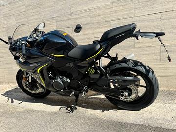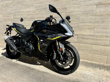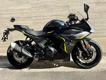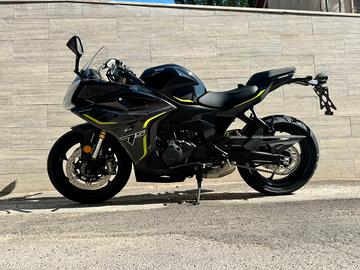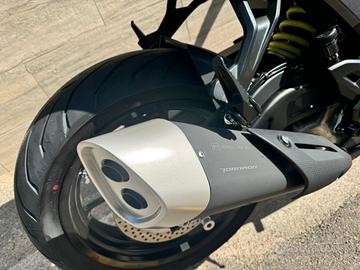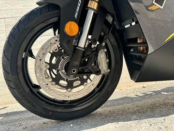 Tornado 550 è il nuovo modello di riferimento di Benelli nel segmento delle carenate: linee scolpite e aggressive per una supersportiva stradale perfetta anche per l'utilizzo quotidiano. Spinta da un bicilindrico parallelo da 554 cc contraddistinto dal manovellismo a 270° e da un cambio a 6 rapporti - evoluzione del celebre propulsore Benelli da 500 cc - la Tornado 550 eroga 56 CV a 8.250 giri/min e 54 Nm a 5.500 giri/min. Il telaio a traliccio in acciaio sfrutta il motore come elemento strutturale, garantendo rigidità e maneggevolezza, in combinazione con sospensioni regolabili Marzocchi e freni Brembo. La dotazione tecnologica è completa e all'avanguardia: display TFT a colori da 5", connettività Wi-Fi e Bluetooth, porta USB-C, traction control, due riding mode e sistema TPMS integrato.