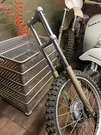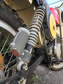 Ammortizzatori restaurati nell'estetica ed idraulica. Monta forcella "moderna" con disco ma fornisco anche la sua Ceriani originale da 35mm e cerchio.