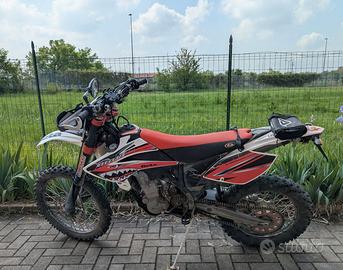 Splendida Beta RR Factory 2008 (modello 2009), monta motore KTM RFS 400cc, ovvero uno dei motori da enduro più robusti e longevi mai realizzati. La versione Factory monta forcelle Marzocchi Magnum da 50mm a cartuccia chiusa, scarico Leovince in titanio, pedane maggiorate e numerosi particolari in ergal e carbonio. Sono il secondo proprietario della moto e ce l'ho da 4 mesi, il precedente proprietario l'ha usata pochissimo e l'ha conservata in modo eccellente. Io ho fatto fare il tagliando completo e la revisione della pompa del freno posteriore. La moto monta pneumatici Michelin Enduro Medium e mousse posteriore Michelin, con 19 ore di utilizzo. Appena l'ho presa ho fatto fare la revisione, quindi è a posto per i prossimi 20 mesi. La moto va meravigliosamente bene, ed è efficacissima e facilmente gestibile in off-road.