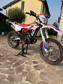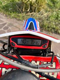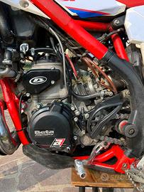 come da manuale ogni 100 ore è stato sostituito il pistone, a 220 ore è stato sostituito pistone biella cuscinetti di banco e frizione... attualmente la moto ha 288 ore.. manutenzione accurata cambio olio ogni 15 ore e verrà consegnata con olio nuovo... a 270 ore sono state revisionati le forcelle e il mono, prima dell'estate sono stati sostituiti i cuscinetti del leveraggio i cuscinetti delle ruote montato racecap e sostituzione della trasmissione, montando una rapportatura un pochino più lunga per garantire un centinaio di chilometri con un pieno... batteria nuova..attualmente ha smontato il miscelatore ma è collegabile tramite due cavi e un tubo... gomma anteriore al 80% con all'interno un mousse con all'attivo una ventina di ore stessa cosa per la mousse posteriore... porta targa estraibile...