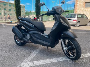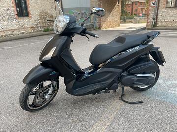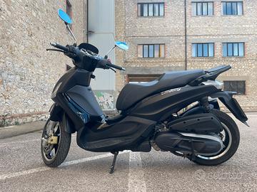 Beverly 350 Police ABS ASR versione bicolore nero opaco e lucido, cerchi in lega, chiave con telecomando apertura sella e fari, frizione in bagno d'olio.