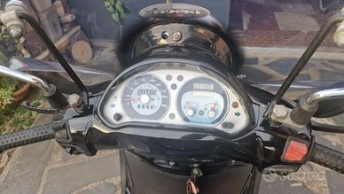 Scooter in ottime condizioni. Appena effettuato da me tagliando completo di tutto. olio, filtro olio, filtro aria, freni, cinghia, rulli, pulizia corpo farfallato e candela. Ammortizzatori e forcella sostituiti due o tre anni fa, quindi perfetti. Non necessita di niente in più regalo due parabrezza praticamente nuovi e le borse laterali. La sella è a sistemare una cucitura.....