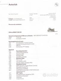 Vendo splendida BMW F 850 GS Trophy, ultima serie prodotta prima della 900, in colorazione Gravityblue Metallic, con soli 7500 km certificati. Moto pari al nuovo, sempre custodita in garage e mai utilizzata in off-road. Acquistata nuova NO KM0/DEMO a fine 2023 presso concessionaria ufficiale BMW Autoclub Modena, con tagliandi regolari eseguiti in rete ufficiale e garanzia BMW Motorrad attiva. Allestimento completo con pacchetti ufficiali BMW: •Pacchetto Comfort: Dynamic ESA, Keyless Ride, cavalletto centrale, catena M Endurance •Pacchetto Dynamic: faro Full LED, luci diurne a LED, cambio elettroassistito PRO •Pacchetto Active: modalità di guida PRO, MSR (Dynamic Engine Brake Control) •Pacchetto GS Trophy: paramani, parabrezza standard, predisposizione navigatore GPS, portapacchi maggiorato Dotazioni principali: •Connectivity TFT Display •ABS Pro e DTC (Dynamic Traction Control) •Manopole riscaldabili •Cruise Control •Supporto valigie e portapacchi maggiorato Condizioni generali: La moto è in perfette condizioni estetiche e meccaniche, sempre mantenuta con la massima cura. Custodita in garage, utilizzata esclusivamente per turismo su strada, senza alcun segno di usura anomala. Componenti, pneumatici e trasmissione in eccellente stato. Modello GS Trophy, molto apprezzato per equilibrio, comfort e affidabilità, considerato da molti l’ultima vera F 850 GS “pura” prima del passaggio alla nuova 900. SCARICO NON INCLUSO NEL PREZZO