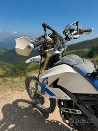 Moto in ottime condizioni, maneggevole sia in strada che in enduro, motore Rotax, serbatoio centrale, filtro aria alto. Manutenzione regolare: pulizia e oliaggio filtro aria, trasmissione, olio motore, filtro olio. Pastiglie freni nuove a 23000km, forcelle anteriori (paraoli, tenute, para-polvere e olio..) , candele iridium Accessori: sospensione posteriore originale ad aria disponibile ma sostituita con ohlins a gas con serbatoio separato regolabile (valore circa 1000e), sostituite frecce ant e post (disponibili le originali), leve freno frizione, lampadine faro ant e posizione a led, silenziatore leovince (circa 650e)(disponibile originale), gomme e camere aria 4mm (350e) e codino riverniciato doppio strato (150e), cambiato corona/pignone per rapporti più corti. Rifatta sella con grafica dedicata by arc design (250e), portatarga corto con catarinfrangente (disponibile originale). Disponibile anche piastra touratech portaborse posteriore.