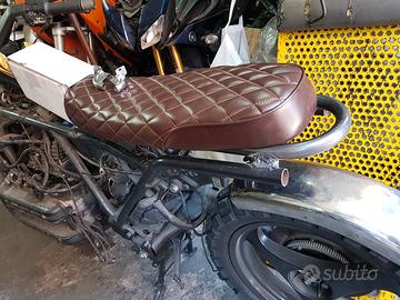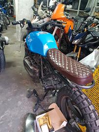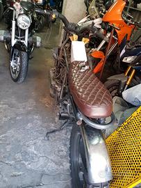 Vendo moto d'epoca, iniziata trasformazione in scrambler. Ruote continental tacchettate montate, serbatoio colorato e modificato, sella nuova, telaio accorciato, motore controllato e cardano e frizione revisionati. Possiedo sterzo buell, marmitta bmw di un 650. Trasformazione al 75% manca poco.....collegamento cavi e strumentazione, fari e frecce, parafango. Vendo perché non riesco a portarmi avanti e.mi sono scocciato....ferma dal meccanico da 5 anni.