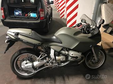 vendesi bmw r1100 s la moto attualmente la colorazione e verde militare , si tratta di pellicola (plasti dip) torna al suo colore originale (rosso) togliendola . la carrozzeria e ottima , la moto non e mai caduta il tagliando e stato effettuato da poco , batteria , liquidi, filtro aria , candele primaria e secondaria le gomme sono an 60% la moto ha in dotazione il kit supporto borse, il doppio cavalletto , i semimanubri touring, le protezioni per le testate ed il paramotore sottoscocca in carbonio.