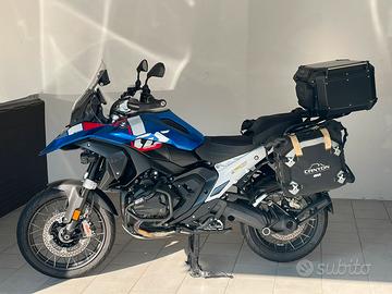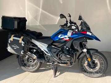 Vendo con: terminale Akrapovic, tris borse montate su telaio Givi ad attacco rapido, composto da bauletto GIVI Outback Evo Total Black 58l con schienale, borse morbide Givi Outback, con unica chiave, para motore GIVI, raiser manubrio Touratech, sella SR, clacson maggiorato, copertina serbatoio, fianchetti anteriori wrappati neri, attacchi borse e scarico originale nuovi, garanzia ufficiale BMW.