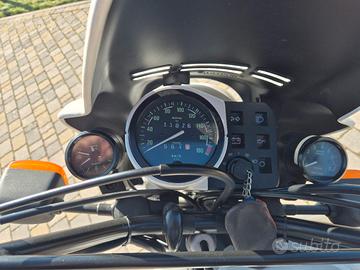 Dotata di tutti i possibili allenamenti: due strumenti aggiuntivi cruscotto , cupolino originale, Doppia sella , supporti borse , borse , leva messa in moto aggiuntiva pedale , mono posteriore WP e originale, portapacchi posteriore, serigrafie serbatoio quasi perfette , autografo serbatoio perfetto (non scolorito o adesivo) ,gomme tassellate Michelin , cerchi e raggi lucidi , colore motore brillante non ingiallito. libretto e targa originali 11800 km