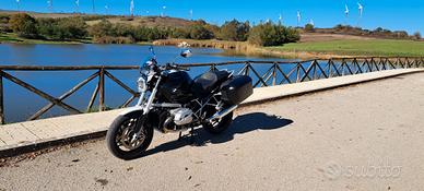 Bmw r1200r classic (colorazione particolare con fascia bianca, specchietti e scarico cromato, cerchi a raggi), motore bialbero. Optional: cupolino sport, protezione testaste cilindri, cerchi in lega, sella comfort alta, valigie laterali. Moto dotata di manopole riscaldabili, abs e asc, no esa. Manutenzione: oltre alla normale manutenzione (cambio olio motore e trasmissione, filtro olio e aria), sono stati sostituiti, nonostante i pochi km, la cinghia servizi, le candele, la batteria, il liquido freni. È stato effettuato il controllo e registrazione gioco valvole. Moto perfetta e tenuta sempre in garage. Gomme con pochissimi km pirelli diablo rosso 4.
