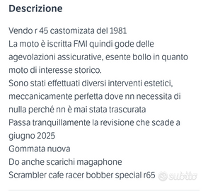 La moto è di interesse storico iscritta FMI quindi gode delle agevolazioni assicurative, esente bollo, sempre tagliandata, passa tranquillamente la revisione, tutta rimessa al nuovo. Per qualsiasi informazione chiamate