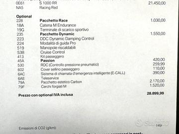 Motociclo BMW S 1000 RR RACING RED, anno 2023 con soli 8000 km, uniproprietario, full optional con pacchetto Race (catena M Endurance, terminale di scarico sportivo Akrapovic), pacchetto Dynamic (DDC Dynamic Damping Control, modalità di guida PRO, manopole riscaldabili, cruise control, kit passeggero), pacchetto Passion, RDC controllo pressione pneumatici, cover sellino passeggero, sistema di chiamata intelligente E-CALL, pacchetto estetico CARBON, cerchi forgiati M. Prezzo di listino moto nuova: 28900 euro. Nostro prezzo: 20500 euro. Book fotografico con oltre 50 foto e video della moto accesa in alta definizione sul nostro sito: www.zanimotor.it Finanziabile in sede. Possibilità di videochiamata con whatsapp. Permutiamo l'usato di nostro interesse. E' gradito il contatto telefonico. CONTATTO VELOCE: CEL RICCARDO Seguici anche su Instagram/Facebook: Zanimotor *** ACQUISTIAMO LA VOSTRA MOTO USATA (SE DI NOSTRO INTERESSE), ANCHE D'EPOCA, CON PAGAMENTO IMMEDIATO. TRATTATIVA SUPER VELOCE. PER MAGGIORI INFORMAZIONI NON ESITATE A CONTATTARCI. *** - INVIACI LE FOTO E LA DESCRIZIONE DELLA TUA MOTO USATA, TI INVIEREMO LA NOSTRA MIGLIOR PROPOSTA D'ACQUISTO, OPPURE CONTATTACI DIRETTAMENTE AL NOSTRO RECAPITO TELEFONICO - I motocicli in vendita sono di esclusiva proprietà della ZANIMOTOR (no conto vendita e mediazione) a garanzia di selezione e qualità, venduti con regolare contratto e fattura di vendita.