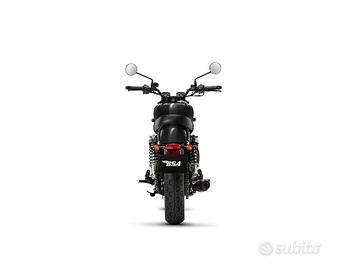 BSA GOLD STAR 650 SHADOW BLACK Euro5 MOTORE Tipo di motore - Raffreddato a liquido,monocilindrico, DOHC, 4 valvole, doppia accensione Cilindrata del motore - 652 cm³ Rapporto di compressione - 11,5:1 Coppia massima - 55Nm@4000 giri/min. Potenza massima - 45 CV a 6500 giri/min. Trasmissione - 5 marce Sistema di raffreddamento - liquido SOSPENSIONE Anteriore - Forcella telescopica da 41 mm Posteriore - Due ammortizzatori con precarico regolabile in 5posizioni PESI Peso in ordine di marcia - 213kg RUOTE & PNEUMATICI Pneumatico anteriore - 100/90-18 Pirelli Phantom Sportscomp Ruota anteriore - Cerchi in lega a 36 raggi da 18 x 2,5 pollici Pneumatico posteriore - 150/70-R17 Pirelli Phantom Sportscomp Ruota posteriore - Cerchi in lega a 36 raggi da 17 x 4.25 pollici FRENI Anteriore - Disco flottante singolo da 320 mm,pinza flottante Brembo a due pistoni, ABS doppio canale Posteriore - Disco singolo da 255 mm, pinza flottante Brembo a unpistone, ABS doppio canale SERBATOIO CARBURANTE Capacità totale - 12 litri Consumo di carburante - 4,001 L/100 km (WMTC) DIMENSIONI Interasse - 1.425 mm Altezza sella - 780 mm Inclinazione - 26,5 gradi