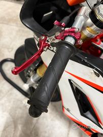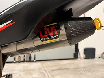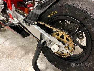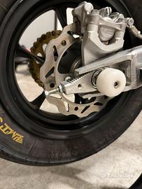 Una unica scivolata in uscita da un tornate quindi a bassa velocità, un piccolo foro alla carena sx prontamente ripristinato, il resto delle carene sono integre; insieme alla moto lascio alcuni ricambi: