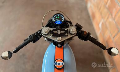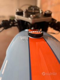 Vendo cafe racer su base mash seventy five 125! Infiniti lavori effettuati: avantreno completo ducati monster, impianto frenante anteriore e posteriore ducati, ammortizzatore posteriori rfy, serbatoio custom 9l con tappo custom, fanale a led e frecce led custom, tachimetro digitale, filtro a cono, impianto elettrico e vano batteria nascosto sotto la sella, archetto telaio posteriore e porta targa alla ruota , pedane e leve custom, sella cafe racer, semi manubri in alluminio ricavati dal pieno, gas rapido domino, specchietti end bar, verniciatura professionale con livrea gulf, catena nuova, appena tagliandata! Documenti tutti in regola, revisione fino a 06/26! E sicuramente mi sono dimenticato qualcosa! Moto perfetta in ogni dettaglio sia meccanica che ciclistica e carrozzeria!,Vendo per passaggio a altra cilindrata con altre parti originale e custom (altro serbatoio, manubrio frecce sella ecc,) e due barili gulf in corredo! No perditempo!