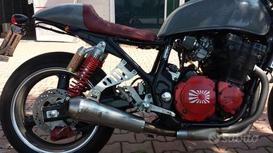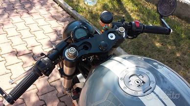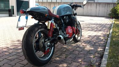 Vendo café racer su base suzuki inazuma 750 del 1999; modifiche eseguite: sostituzione avantreno (forcelle, freni) con parti suzuki gsxr 750 e costruzione piastre forcella ricavate dal pieno in ergal, semi manubri ricavati dal pieno in ergal, trattamento serbatoio tankerite, pompa freno ant. Aprilia rsv4, pedane ricavate dal pieno, sostituzione filtro aria con filtri a cono singoli (eseguito allineamento carburatori con vacuometro), porta targa a traliccio regolabile, fari anteriore posteriore e frecce sostituiti, complessivo codone e sotto sella in vetroresina rinforzata, sella in pelle artigianale, strumentazione koso, scarico mass omologato. Gomme nuove (percorsi 500 km). Ferma da 3 anni, ma andava in moto al primo colpo. Lavori da fare: ripristino batteria, ripristino specchietti (quelli in foto sono già venduti) cambio olio motore e pulizia filtro (era nuovo).