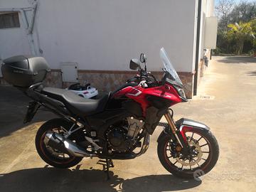 Cb 500x accessoriata di bauletto, marsupio serbatoio, paramani,cavalletto centrale, faretti supplementari e giacca moto HONDA originale taglia 50,barre para motore inferiori e superiori..COMPRATI A PARTE,moto ancora in GARANZIA casa madre x 4 anni... , colorazione rossa la più bella e ricercata...solo 7000km x poco utilizzo..ultima versione con doppio disco forcella anteriore aggiornata e sistema luci led ...guidabile anche con patente A2..consumi bassissimo e tagliando annuale in casa madre honda sui 120 euro...prezzo poco trattabile