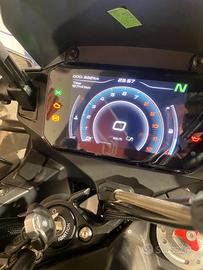 Moto accessoriata di piastra e bauletto.