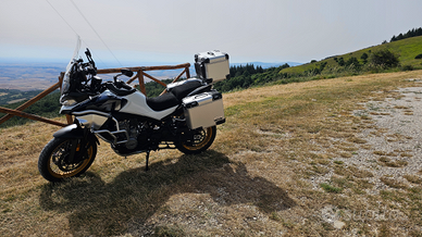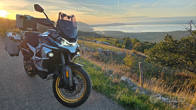 Vendo CFMOTO 800MT Explore del febbraio 2024 con km 18.000 perfetta in tutto. La cedo completa di tutti gli accessori presenti montati: tris bauletti originali + maniglia aggiuntiva bauletto posteriore, barre aggiuntive di protezione motore e carena, frecce dinamiche con luci diurne, specchietti corti CNC, guidacatena ktm, paraschizzi corona, trasmissione sostituita con catena did, corona jt e pignone silenziato ktm, scarico in titanio + decat Arrow, filtro aria Sprintfilter, mappa a banco Saverio Fucile racing di Avellino e regolazione sospensioni, kit rimozione Evap ancora da montare, antifurto completo Patrolline, gomme Pirelli Scorpion Trail III 1000km, set completo protezioni serbatoi olio freni, pinze freno, radiatore, collettori e filtro olio, sensori abs anteriore e posteriore, corpo farfallato, steli forcella, paraschizzi ammortizzatore posteriore, basetta cavalletto laterale, finger clutch frizione + cavo completo di riserva originale CFMOTO, prolunga pedale freno CNC, clacson Hella 100db, pellicola in vetro su misura TFT, cupolino touring Givi + cupolino sport fumè, copriselle e cuscini in gel, sensore temperatura esterna Koso, tamponi mozzo ruota anteriore, telaietto supporto navigatore/cellulare, strips cerchi e protezioni carena. Sicuramente ho dimenticato ancora qualcosa. Inutile dilungarmi su caratteristiche, componentistica ed accessori di serie che, ormai, si conoscono già ed inutile dilungarmi su tutto quanto aggiunto a parte e sui relativi costi sostenuti anch'essi conosciuti. No commercianti e affaristi. Solo persone realmente interessate.