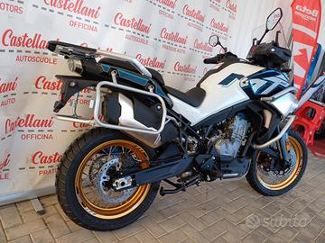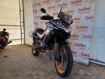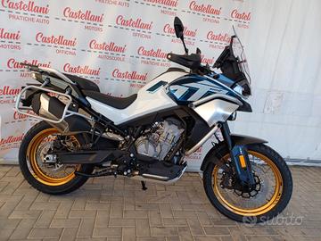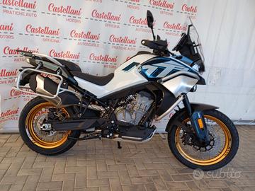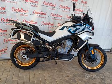 800MT EXPLOREAVVENTURA SU OGNITERRENOLa maxi enduro progettata per il divertimento e il viaggio su ogni terreno.Motore bicilindrico basato su piattaforma KTM da 799 cc di 67kW (91,1 CV) di potenza: Elevate prestazioni e bassi consumi per affrontare qualsiasi viaggio.Ciclistica all'avanguardia grazie a forcella e ammortizzatore KAYABA upside-down, cerchi a raggi incrociati, pneumatici Michelin Anakee 110/80 R19 all'anteriore e 150/70 R17 al posteriore: stabilità e sicurezza in ogni condizione.Equipaggiamenti di serie unici: Cornering ABS, schermo TFT, parabrezza regolabile, 2 ride modes, acceleratore elettronico ride by wire e cruise control, sella e manopole riscaldate, ammortizzatore sterzo, cavalletto centrale, Quickshift bidirezionale, paramani e para-motore e TPMS.Strumentazione MMI da 8 pollici con angolo di visualizzazione di 180°, connettività Bluetooth e visualizzazione delle mappe del navigatore da smartphone: massima comodità in viaggio.