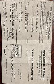 Vendo Piaggio Ciao 50P/PV d’epoca (telaio C6E1T, originale, mai manomesso) del 11/1979; prima vernice colore grigio canna di fucile. Miscela 2%. Targato e con libretto originale. Fermo in garage e non utilizzato da molti anni e pertanto necessita di manutenzione. Ottimo stato di conservazione. Vendibile con casco Aprilia L60.