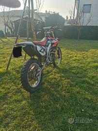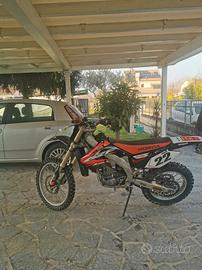 Vendo crf 450 del 2002 a malincuore. La moto è stata rifatta completamente. Doppia omologazione motard/enduro e targata con revisione già effettuata. Lavori eseguiti: -forcelle revisionate -mono revisionato -motore rifatto da testa ai piedi -cambio nuovo -trasmissione nuova -impianto frenante revisionato -Frizione nuova -scarico nuovo Fornisco anche accessori come mascherina cross e mascherina con i fari, manopole, kit motard (ruote e molle forcelle) La moto è una bomba e va da dio, l'ho utilizzata solo 10 ore. Non esitarmi a contattarmi per unteriori informazioni.