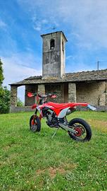 Vendo stupendo CRF 450 R motard con tripla omologazione (cross, enduro e motard) La moto presenta circa 30 ore di utilizzo, tagliandata ogni 8 ore circa e non presenta nessun problema meccanico. Guidabile da subito. Ultimo modello prodotto con doppio scarico omologato, con la moto vengono dati anche i cerchi da enduro senza gomme. Gomme motard, pignone, corona, catena e batteria nuova maggiorata con solo 6 ore di utilizzo. Qualche graffio sulle carene per una caduta da fermo, ma per il resto perfetta. Mai usata in pista 3 mappe di guida (Rain, normal e sport) Launch control