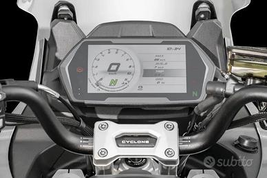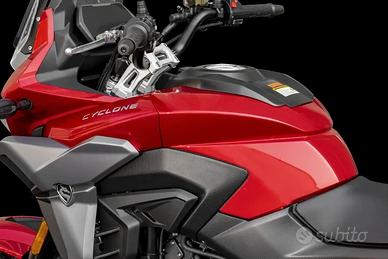 Crossover totale ogni giorno La Cyclone RX650 è una crossover polivalente, perfetta per l'uso quotidiano, le gite fuori porta e i viaggi. Offre comfort, affidabilità ed una versatilità senza pari, disponibile in Rosso o Grigio. Dotata di un motore bicilindrico di 650 cc sviluppato con la collaborazione tecnica di Norton/Ricardo ed in grado di erogare 71CV e 62NM di coppia con frizione antisaltellamento. La sicurezza ed il controllo sono di serie: ABS Bosch, impiato frenante J.JUAN con pinze radiali su dischi a margherita, sospensioni completamente regolabili KYB. Comandi retroilluminati, fari Full LED, display TFT da 6,75'' personalizzabile e predisposto per Mirror Link e Navigazione completano la dotazione tecnologica di bordo. Pronta per affrontare qualsiasi tipo di sfida: dal commuting urbano al divertimento nelle strade di montagna, la RX650 si trova sempre a suo agio. Con un serbatoio da 21lt è inoltre pronta ad allungare gli orizzonti dei tuoi viaggi garantendoti quasi 400km di autonomia.