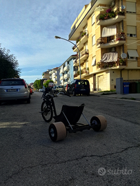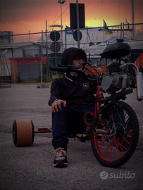 Il prototipo è completamente artigianale creato da una vecchia bmx tagliata a metà con un continuo del telaio posteriore con dei tubolari, le ruote dietro sono libere la trazione è su quella davanti spinta da una catena. Originariamente montava un motore 50cc per rivenderlo l'ho maggiorato ad 80 (un secondo kit) che si trova attualmente con meno di 1 ora di utilizzo. Il mezzo è divertente e perfetto per ragazzi che si vogliono intromettere nel mondo dei motori imparando dalla base. Attualmente gli unici 2 problemi che ha sono la mancanza di una catena e la ruota con i raggi lenti per il resto è perfetto ciò significa che con 50 euro lo portate a nuovo. Per qualsiasi domanda rimango disponibile, prezzo poco trattabile