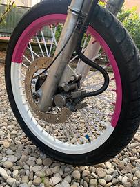 vendo a malincuore come da titolo fantastico dt 125 re immatricolata a fine 2006 con all attivo poco più di 22000km per passaggio a cilindrata superiore e stato rifatto: pistone vertex bifascia cuscunetti di banco cambio olio filtro dell aria catena corna pignone revisionate forcelle revisionato mono e leveraggi rivista esteticamente praticamente tutta ho installato piatta e parafango del yzf250 e sistemato dei difetti delle plastiche originali para mani bianchi manopole rosa frecce nano led faretto led porta targa pieghevole contachilometri digitale comando gas rapido scarico completo athena shorty ( dispongo della pancia originale e terminale giannelli) cerchi bicolor gomme cambiate meno di 300 km fa bollo pagato revisionata fino al 2027 tutto fatto meno di 1000km fa scaldata sempre prima di ogni utilizzo rodaggio pistone fatto con 4 pieni e miscela al 3% miscela sempre fatta con motul 710 omologata per 2 (dispongo anche delle pedaline) moto perfetta anche se ha i suoi anni ha molto da offrire e divertente per coloro che si approcciano al mondo delle 2 ruote per la prima volta e non solo prezzo poco trattabile no perdi tempo no affatisti non ho fretta di venderla valuto scambi con moto a2 oppure auto da neopatentato di mio gradimento con eventuale aggiunta da parte mia yamaha hm ktm tm honda husqvarna 125 250 450 motard enduro cross