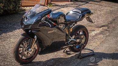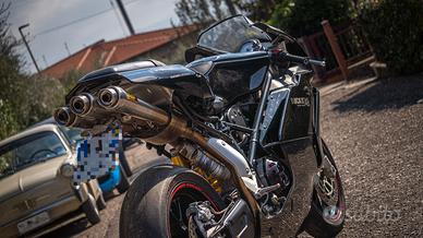 Vendo splendida Ducati Superbike 749 del 2006 con 19000 km. Rara colorazione carene nere su telaio nero, di solito il telaio è grigio. Depotenziata a libretto a 25 Kw secondo vecchia normativa, con tutte le conseguenti agevolazioni ovvero guidabilità con patente a2 a 18 anni, bollo e assicurazione ridotti. Da quest'anno è iscrivibile asi o fmi in quanto ventennale. Monta uno scarico Mivv a 3 uscite con relativi collettori ed è stata mappata dal precedente proprietario. Batteria nuova. Cedo tutti i pezzi originali compresi scarico, collettore del cilindro orizzontale, specchi e pedaline passeggero, oltre a un secondo kit di carene in fibra di vetro replica fila da finire. Moto perfettamente marciante e pronta all'uso, sempre tenuta da amatore e in mio possesso da ormai 7 anni. Mezzo da collezionista viste le peculiarità e le condizioni ben visibili anche in foto, quindi astenersi perditempo e affaristi della domenica. Non scambio, non spedisco e soprattutto non svendo. Prezzo trattabile. Chiamare nel pomeriggio.